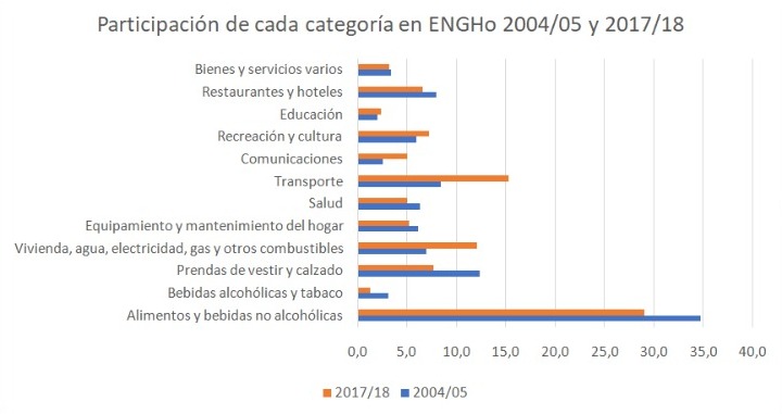 Las diferencias entre ambas encuestas son significativas. En la ENGHo 2004/05, los servicios públicos representaban el 7% del gasto de los hogares del NOA. En la encuesta de 2017/18, esa participación sube a 12,1%, un salto del 72,9%. Lo mismo ocurre con el transporte, que casi duplica su peso al pasar de 8,4% a 15,3%. Las comunicaciones también crecen de forma drástica: suben de 2,6% a 5%.